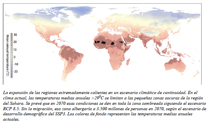 Este rápido aumento de la temperatura, combinado con los cambios previstos en la población mundial, significa que alrededor del 30% de la población mundial prevista para 2070 vivirá en lugares con una temperatura media superior a los 29°C, si las emisiones de gases de efecto invernadero siguen aumentando. Estas condiciones climáticas se dan actualmente en sólo el 0,8% de la superficie terrestre mundial, principalmente en las partes más calientes del desierto del Sahara, pero para 2070 las condiciones podrían extenderse al 19% de la superficie terrestre del planeta.