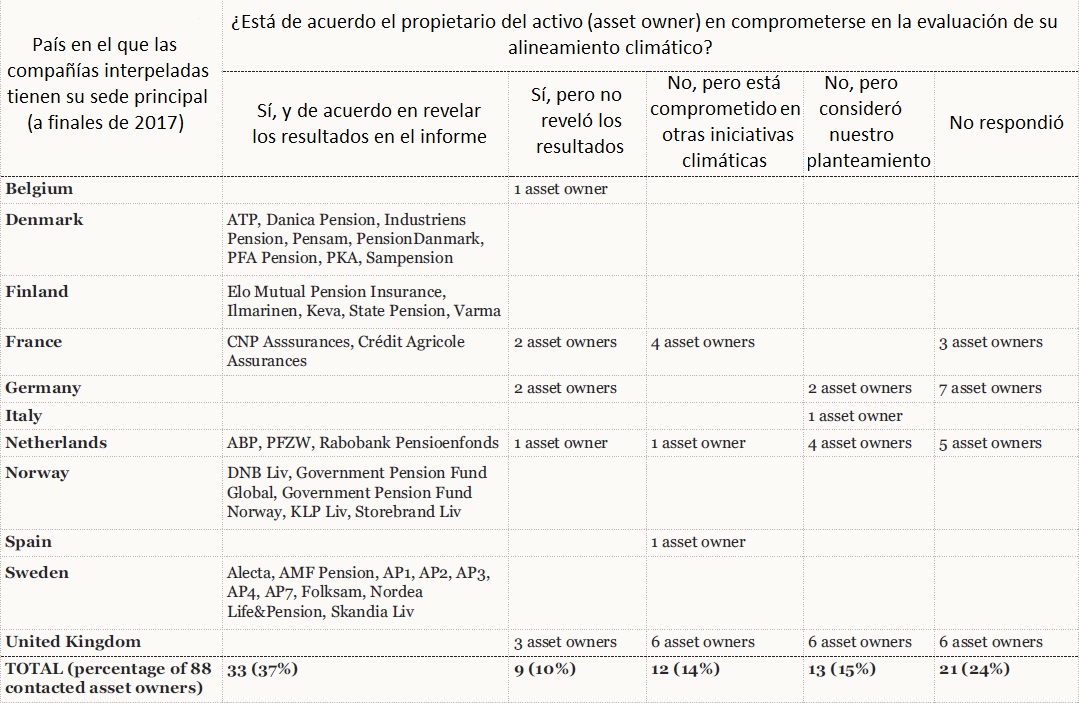 La organización conservacionista WWF ha identificado a los 100 mayores propietarios de activos de 11 países europeos (Alemania, Bélgica, Dinamarca, España, Finlandia, Francia, Italia, Holanda, Noruega, Suecia y Reino Unido) y ha contactado a 88 de ellos para realizar una evaluación sobre su "alineamiento y exposición de sus carteras de acciones cotizadas y bonos corporativos" a una serie de tecnologías claves para el clima -centrales térmicas de carbón; energías renovables; minería de carbón; producción de petróleo; y producción de gas- con respecto a escenarios climáticos futuros 2018-2023. Pues bien, solo 33 de ellos estuvieron de acuerdo en publicar los resultados de su alineamiento climático en este informe.
