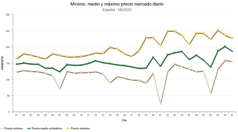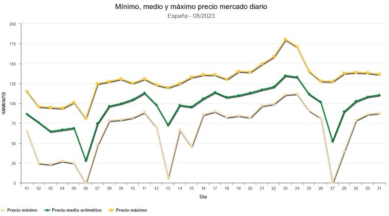 El cambio es altamente significativo. Mientras que en agosto de 2022 se alcanzaron máximos históricos, en agosto de 2023 se ha llegado al cero en el precio del megavatio hora. En concreto dos días, el 6 y el 27 de agosto, con el precio mínimo totalmente gratis. Y también con el precio máximo y medio que en nada se asemejan a los de hace exactamente un año. El día más caro de 2022 fue el 30 de agosto con un precio medio de 201,96 euros por megavatio hora, con un mínimo de 160 y un máximo de 237. Sin embargo, el día más caro de 2023 ha sido el 23 de agosto con una media de 134,94 euros, un mínimo de 111,12 y un máximo de 180,34. La diferencia entre los dos días más caros es de 67 euros.
