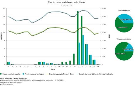 • El 31 de diciembre fue la primera vez que la luz alcanza los cero euros durante algunas horas y que el precio máximo alcanza su cifra más baja a 50,06 euros por megavatio hora. Este fue el día más barato con un precio medio de 2,65 euros el megavatio hora.