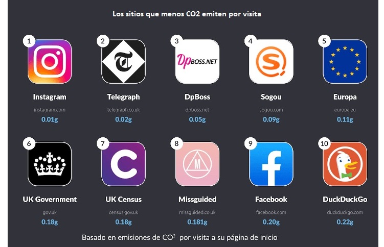 En las antípodas de El Corte Inglés, la red social Instagram es la más respetuosa con el medio ambiente, según el informe de WebsiteToolTester: "gracias a su sencillo inicio de sesión, para entrar a la sección de noticias, la página solo produce 0,01 gramos de carbono cada vez que un usuario entra a su cuenta" (véase a pie de página "Los sitios que menos CO2 emiten por visita).
