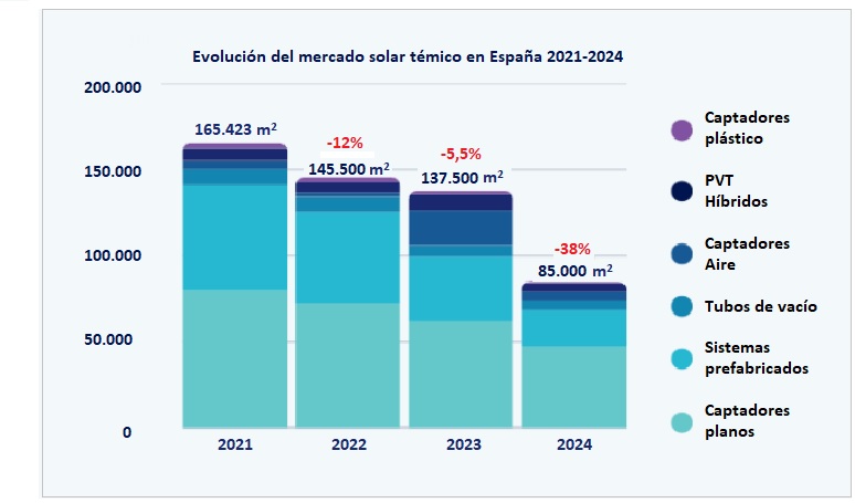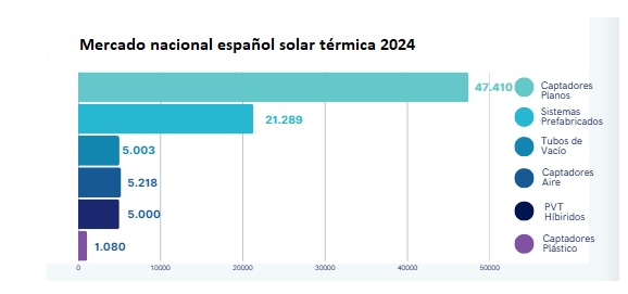 En España, y según los datos de ASIT, el sector industrial solar térmico tiene una capacidad aproximada de producción de un millón de metros cuadrados. En 2024, las fábricas españolas de captadores solares térmicos produjeron sin embargo solo el 8% de su potencial: 85.000 metros cuadrados, de los que 50.000 fueron exportados a medio centenar de países.