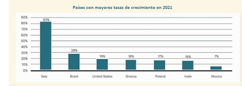 En Brasil la demanda creció un 29% y en Estados Unidos, un 19%. Desde la IEA explican que, en ambos países, el aumento está relacionado con que la gente pasó mucho más tiempo en casa durante la pandemia provocada por el Covid19 e invirtió en soluciones de climatización solar para piscinas. En el caso de Brasil, las ventas para clientes comerciales también se vieron impulsadas por el crecimiento del sector de la construcción y el aumento de los precios de la electricidad provocado por la escasez de energía.
