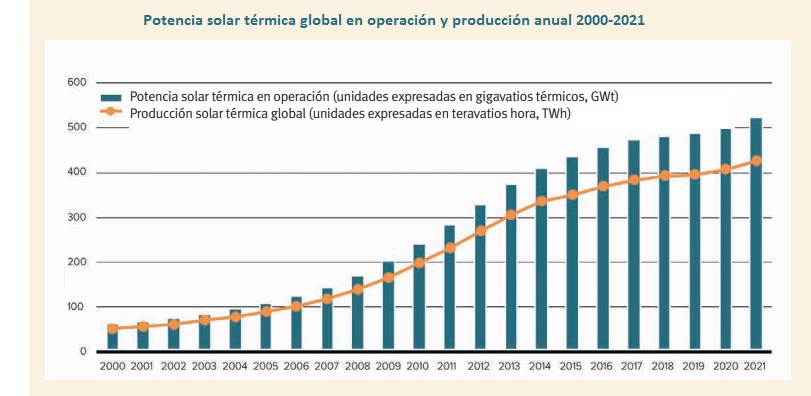 El rendimiento energético global de todos los sistemas solares térmicos instalados en 2021 corresponde a un ahorro de 45,7 millones de toneladas de petróleo y 147,5 millones de toneladas de CO2 no emitido. Esto demuestra la importante contribución de la energía solar térmica a la reducción de las emisiones mundiales de gases de efecto invernadero.