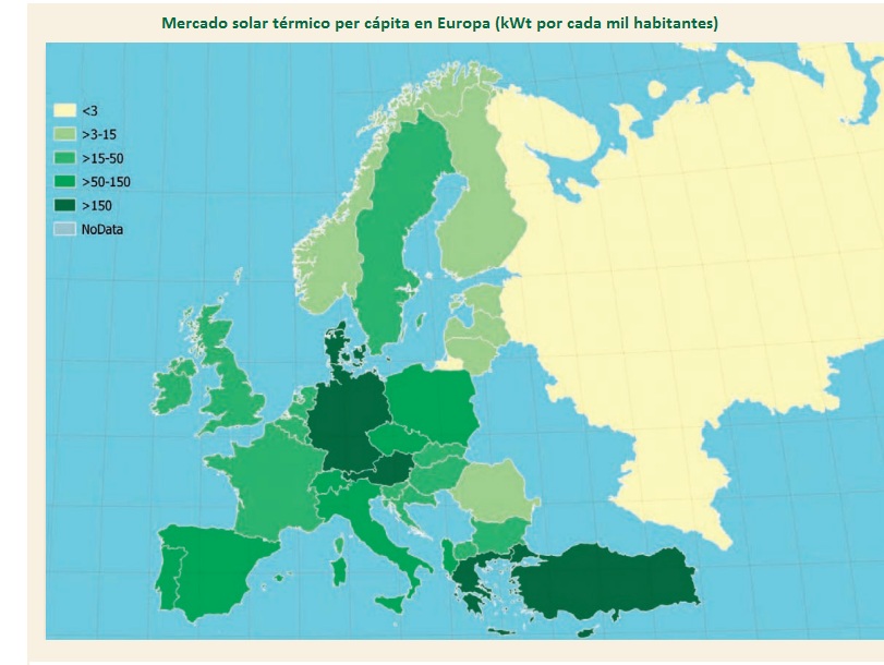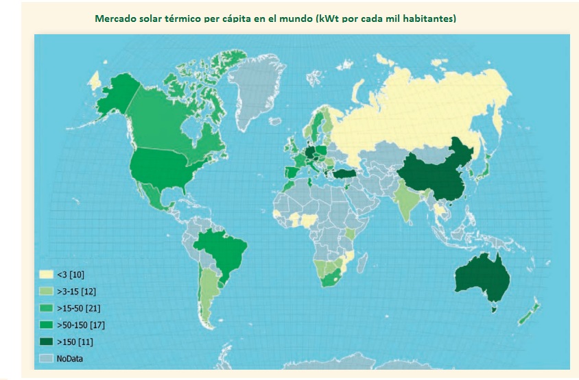 Los tres primeros países en términos de capacidad total instalada a finales de 2020 eran China, Turquía y Estados Unidos. Sin embargo, el panorama es claramente diferente si se comparan los datos per cápita. Los 10 primeros países en términos de capacidad instalada por cada 1.000 habitantes son Barbados, Chipre e Israel. Los colectores de tubos de vacío representaron el 60% de la nueva capacidad instalada en 2020, seguidos de los colectores planos, con un 34%.