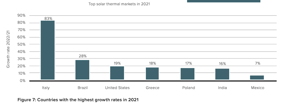 Las políticas de apoyo y el aumento de los precios de los combustibles fósiles han impulsado claramente la demanda de climatización solar. Se han observado tendencias positivas en varios grandes mercados, caso de Italia, que ha experimentado un fenomenal crecimiento del 83% en 2021, impulsado por el aumento de las actividades de construcción combinado con un nuevo plan de reducción de impuestos, el "superbonus" para edificios energéticamente eficientes.