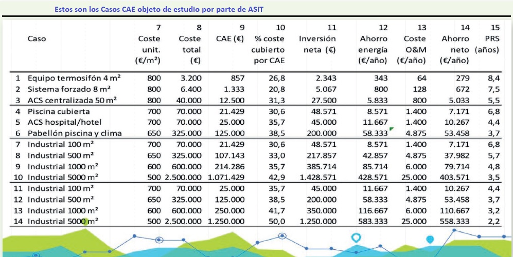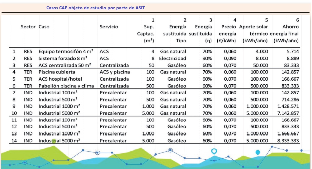 El presente informe incluye el estudio de varios ejemplos concretos para analizar la viabilidad económica de las instalaciones solares térmicas al incorporar los ahorros de la inversión que se pueden conseguir aplicando la metodología CAE. Se podría ampliar el estudio si hubiera otros incentivos que se puedan aplicar y se mejoraría la rentabilidad de la inversión. Para los diferentes sectores (residencial, terciario, industrial) se han seleccionado varios casos de aplicación y el servicio al que se destina la instalación solar térmica: ACS (agua caliente sanitaria), piscinas, precalentar en procesos industriales, etc.