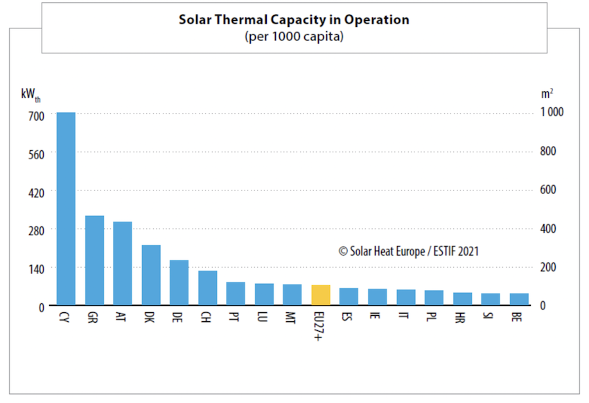 La capacidad instalada en Europa en 2021 llegará a los 27 TWh, según las estimaciones de la asociación. Esto supone un nivel de generación de energía récord para la solar térmica, situándola como una de las principales fuentes de energía renovable en Europa y la primera en términos de capacidad de almacenamiento, con una capacidad total de almacenamiento estimada en más de 187 GWhth.