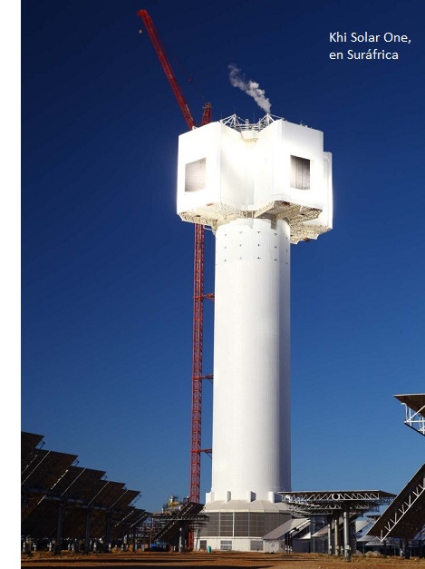 La otra tecnología también concentra la energía solar. Lo hace con colectores cilindroparabólicos a lo largo de los cuales circula (embutido en un tubo) un fluido caloportador (el colector concentra en el fluido todo el calor y ese calor es empleado en un ciclo térmico convencional para generar electricidad).