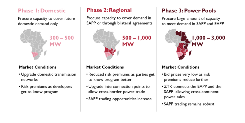 El plan, que ha recibido el apoyo de las autoridades gubernamentales de Botsuana y Namibia y del Banco Mundial, propone un planteamiento por etapas para la construcción de las centrales. La primera fase consistiría en el desarrollo de entre 300 y 500 MW fotovoltaicos y termosolares destinados a satisfacer la demanda interna de los dos países africanos. En las dos fases siguientes podrían sumarse 4 GW que se exportarían a través de interconectores de potencia mejorados con el fin de abastecer a los 17 miembros que integran el Pool de Energía Eléctrica de África Meridional (SAPP, por sus siglas en inglés).