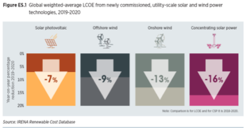 Figura 1: Reducción de costes en términos de LCOE según IRENA (del año 2019 al año 2020)