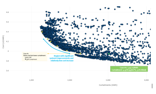 El segundo beneficio técnico es que, a diferencia de lo que se puede pensar, aumentar la capacidad instalada termosolar permite una mayor tasa de penetración de energía fotovoltaica y eólica gracias a que la termosolar disminuye los excedentes de generación (vertidos o curtailments). En un estudio realizado por Protermosolar en 2021 sobre el plan nacional de energía y clima portugués, utilizando una metodología de planificación energética desarrollada por el Ciemat - Figura 5- se representan cientos de simulaciones que cumplen los objetivos de Portugal en emisiones de CO2, instalación de renovables, etc.