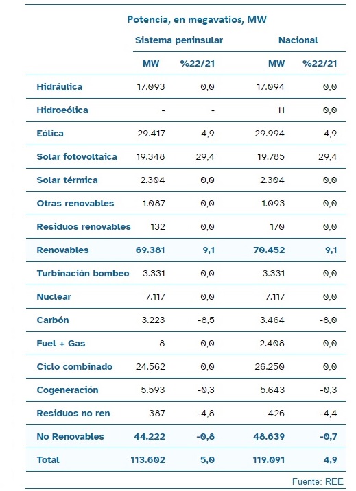 [Bajo estas líneas, a la derecha, tabla con las tecnologías de generación de electricidad presentes en el sistema eléctrico nacional y con sus respectivas potencias. Como se aprecia, eólica y fotovoltaica sumaban a finales de 2022 -fecha de publicación de estos datos por parte de Red Eléctrica de España- casi 50.000 megavatios (ahora mismo ya han superado ese listón)].