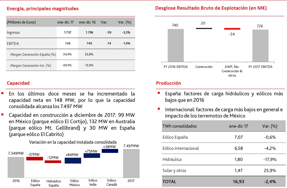 En los últimos doce meses, la capacidad consolidada instalada aumentó en 148 megavatios (MW) hasta a 7.497 MW, de los cuales 2.874 MW son internacionales. La compañía cuenta con nueva capacidad en México (84 MW), India (75 MW) y Canadá (38 MW). A 31 de diciembre de 2017, la producción anual consolidada de Acciona Energía ascendía a 16.929 gigavatios hora.