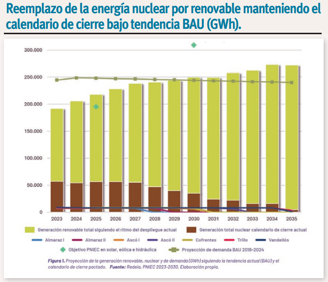 En definitiva, el nuevo informe señala que "extender la generación nuclear en el mix eléctrico nacional no sólo dificulta la descarbonización, flexibilidad y estabilidad del sistema eléctrico, sino que además truncaría el ritmo de despliegue renovable actual. Lejos de reducir nuestro consumo de gas fósil, la prolongación nuclear reduce la generación renovable". "El calendario de cierre es un plan escalonado y esa es su principal virtud porque te permite reaccionar a tiempo y hacer una transición efectiva hacia un modelo mucho más moderno, mucho más flexible, mucho más barato, mucho más eficiente y mucho más adecuado para el mundo en el que vivimos. La solución es evidente y todo el mundo lo sabe, y es desplegar almacenamiento en España para anular el efecto negativo de la intermitencia de la solar y la eólica", concluye Gómez.