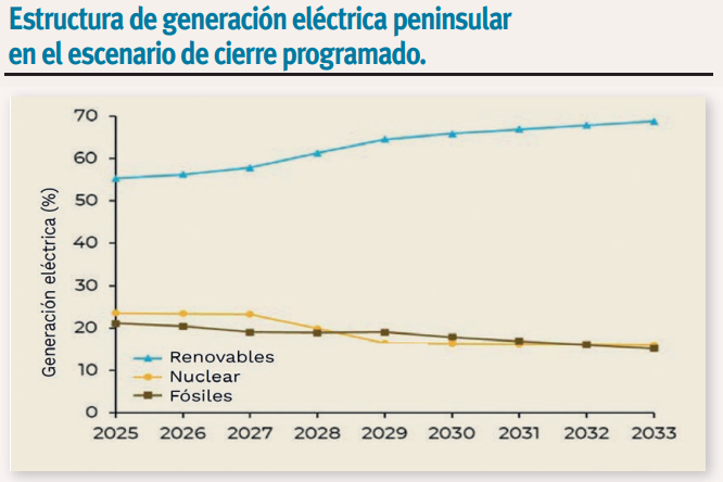 Una pérdida de generación nuclear que según el calendario de cierre actual sería de 56,2 TWh en 2025 a 4,7 TWh en 2035, pero que se podría compensar ampliamente con el despliegue renovable, incluso manteniendo su ritmo de crecimiento actual. Por su parte, si se opta por la opción de extender la vida nuclear, aproximadamente 350,8 TWh de generación renovable se perderían por saturación de la demanda entre 2028 y 2035, "más del triple que en el caso de mantener el calendario de cierre (112,6 TWh)", según el informe de la Fundación Renovables. "El calendario de cierre es pactado y supone una pérdida de generación nuclear en España bastante suave porque se reparte a lo largo de siete años y porque permite compensarse con renovables y con fuentes de energía limpia que no requieren un mayor consumo de gas ni de combustibles fósiles. Es un bulo bastante habitual que el cierre nuclear implicaría un aumento drástico de lo fósil, de las emisiones y del coste de la generación eléctrica en España. Simplemente cerrando las nucleares según el calendario y teniendo el despliegue renovable actual se compensa completamente la pérdida nuclear con generación renovable y se obtiene como resultado un sistema mucho más sostenible, autosuficiente y flexible y barato", añade Gómez.
