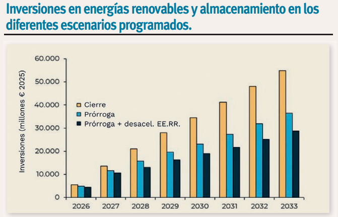 Además, la capacidad inversora también se vería afectada en una posible prórroga. El volumen de inversión es sistemáticamente inferior en todos los años analizados. Durante los primeros ejercicios el impacto es moderado, debido al elevado grado actual de avance administrativo o incluso constructivo de numerosos proyectos. Sin embargo, a medida que el horizonte de decisión se aleja, el efecto de la prórroga sobre las expectativas del mercado se vuelve cada vez más acusado, ralentizando de forma significativa el desarrollo de nueva capacidad renovable y de almacenamiento. "Hemos cuantificado que la señal a los inversores en renovables afectaría a un entorno a los 26.000 millones de euros de inversión en renovables entre 2026 y 2033, comparada con la tendencia actual. La desinversión ya quedaría tocada, aunque cerrase después de la extensión, y costaría volver a esa tendencia", explica Francisco del Pozo.
