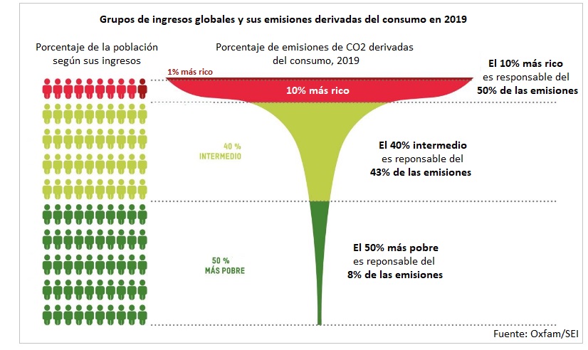 • Desde la década de los noventa (1990), el 1% más rico ha consumido el doble de presupuesto de carbono que la mitad más pobre de la población mundial.