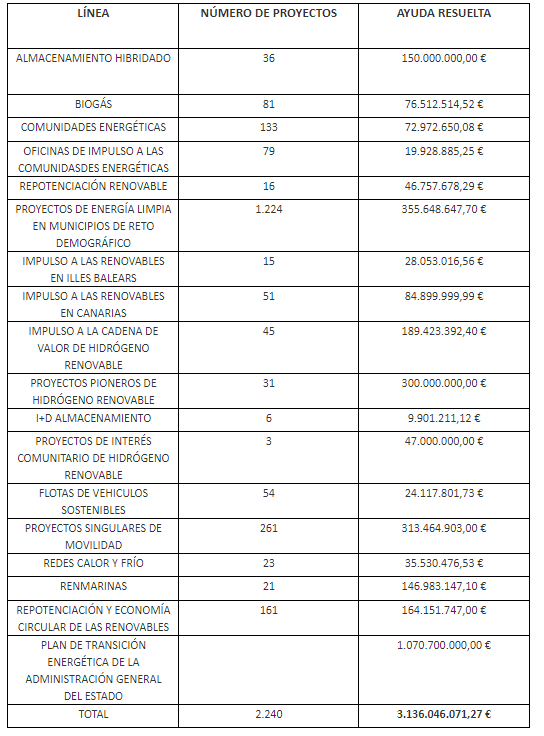 Para conocer el grado de movilización y ejecución de los fondos del Plan de Recuperación, Transformación y Resiliencia (PRTR) destinados al impulso de la transición energética, el IDAE ha abierto una página web en la que se actualizará de manera periódica y que ofrece información detallada de los resultados de las 25 líneas resueltas, por el momento, por el IDAE, incluyendo un mapa donde se identifican los municipios donde se ubicarán los 2.240 proyectos.