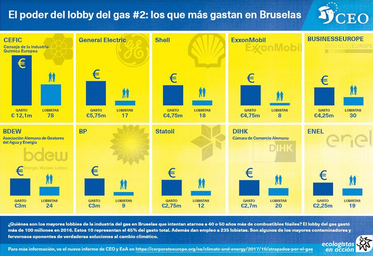 "El informe revela la asombrosa cantidad de dinero gastado por la industria del gas el año pasado en influir a quienes definen las políticas de la UE. Con una inversión de más de 100 millones de euros para hacer presión, las corporaciones gasísticas y sus grupos de interés contrataron a más de mil lobistas, así como a un ejército de consultoras de relaciones públicas", afirma Ecologisgas en Acción. "Una de las ocupaciones de estos grupos de presión ha sido promover el gas como combustible limpio, presentándolo como un puente para la transición hacia las renovables", añade.