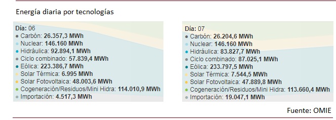 Hoy, el operador del sistema estima que el gas natural de las centrales de ciclo combinado producirá aproximadamente el 11% de toda la electricidad que va a demandar España. Es decir, que el 89% de la energía eléctrica será producido en otras instalaciones de generación. [Véase bajo estas líneas, a la derecha, la energía diaria, según OMIE].