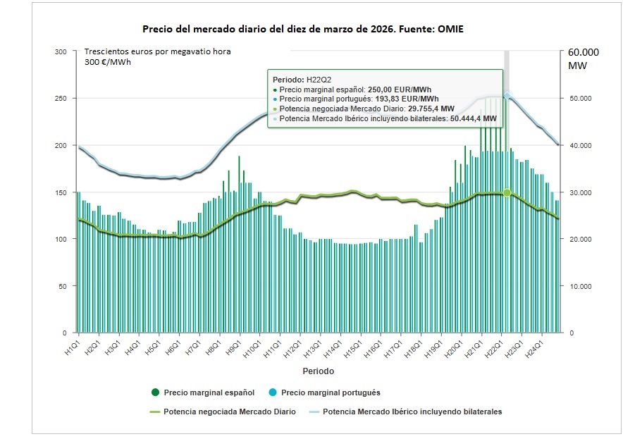 El precio medio de la electricidad en el mercado mayorista, el denominado pool, se dispara este martes hasta los 136,86 €/MWh (precio medio), tocando así máximos que no se veían desde mediados de febrero del año pasado. El mercado mayorista repunta así un 14,6% (hablamos siempre de precio medio diario) con respecto a los 119 €/MWh de ayer lunes (todos los datos son del Operador del Mercado Ibérico de Energía, OMIE). Habría que retroceder hasta el 17 de febrero de 2025 para encontrar un precio medio diario más alto en el mercado mayorista eléctrico, cuando marcó los 138,17 €/MWh para esa jornada. A lo largo de este martes se verán así máximos de 250 €/MWh entre las 21.00 y las 23.00 horas, mientras que habrá mínimos de 94,91 €/MWh entre las 14.00 y las 15.00 horas (horario durante el cual la aportación solar fotovoltaica al mix eléctrico nacional es mayor).