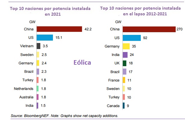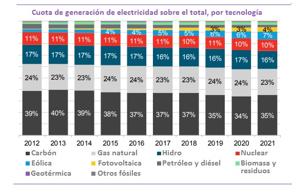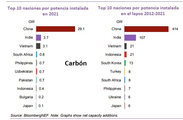 El encarecimiento del gas ha impulsado la generación con carbón. Hasta el punto de que, como se dijo, este ha fijado un nuevo máximo histórico de producción de electricidad: 9.600 TWh, un 8,5% más que en 2020. Eso sí -matiza BNEF-, más del 85% de esa generación ha tenido lugar en solo 10 países. Más aún: el 72% se ha producido en China, India y Estados Unidos.