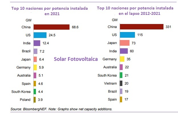 De entre las dos grandes tecnologías renovables, la solar fotovoltaica es la que más dinamismo ha mostrado en 2021. La mitad de toda la potencia instalada se la ha anotado ella: 182 gigavatios (los otros 182 los han sumado entre todas las demás: eólica, hidráulica, nuclear, gas, carbón, etcétera). Su aportación a las redes eléctricas globales ha alcanzado por primera vez los mil teravatios hora (1.000 TWh). Además, la solar fotovoltaica (FV) se ha convertido en una tecnología "esencialmente ubicua", según la terminología BNEF. En casi la mitad de los países estudiados por la consultora en los que se ha añadido nueva potencia a la red en 2021, la solar ha sido la tecnología de generación que más potencia ha añadido. Según el informe, al menos 112 países tienen a día de hoy al menos un megavatio de potencia solar instalado.