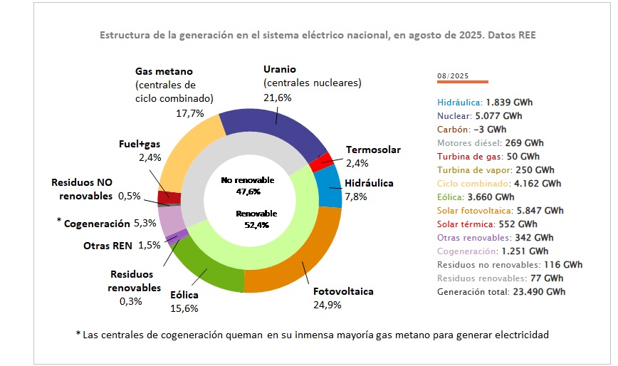 Por lo demás, y en cuanto a la participación de las diferentes tecnologías en la generación, las renovables han incrementado su cuota en este mes de agosto de 2025 un 0,7% con respecto al mismo mes de 2024 (han producido 12.318 GWh). En conjunto, todas ellas (hidráulica, eólica, solar, biomasa) han supuesto una cuota del 52,4% sobre el total de la producción, según los datos provisionales facilitados hoy por el operador (seguramente REE hará correciones menores más adelante, como es habitual).