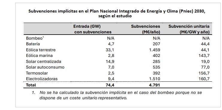 «Alcanzar los objetivos del Pniec oficial a 2030 [los que recoge la tabla de arriba] exige subvencionar las pérdidas de 33,1 GW de capacidad [eólica terrestre]. Lo mismo ocurre en la eólica marina, donde es necesario subvencionar los 2,8 GW previstos [en realidad, el objetivo Pniec dice 3 GW, como se aprecia arriba]; en la termosolar, donde habría que subvencionar 2,5 GW; en las baterías, con 4,7 GW a subvencionar; y en la solar de autoconsumo, con 7 GW a subvencionar (pues se asume que 2 GW entran de forma tendencial). En el caso de la fotovoltaica centralizada, que crece de 37,2 GW a 54,1 GW en 2030, los ingresos obtenidos tampoco serían suficientes para cubrir costes, con lo que alcanzar ese valor requeriría incentivar la entrada mediante subvenciones a la capacidad adicional requerida, de 14,9 GW» (página 18 del documento)