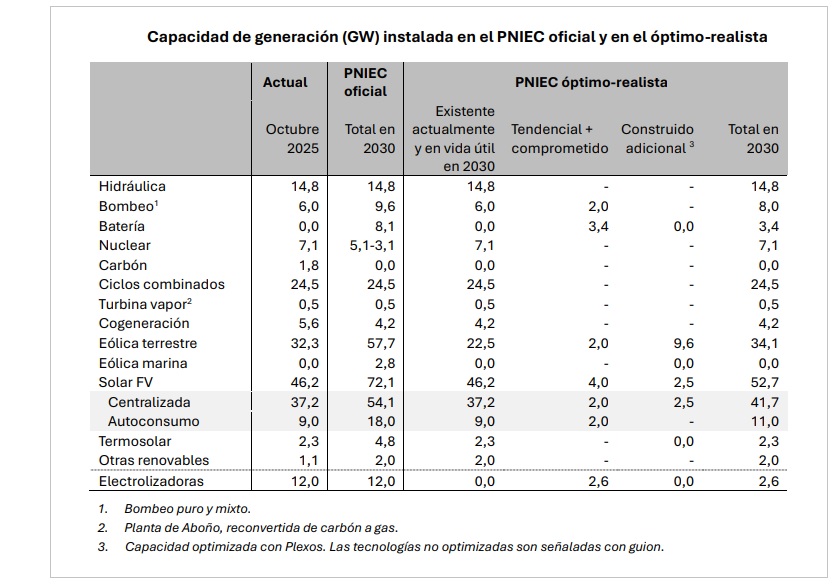 Los autores también concluyen que el resultado del "Pniec óptimo realista" (el que ellos proponen) en términos del peso relativo de la generación eléctrica y de la reducción de emisiones es ligeramente inferior al oficial.