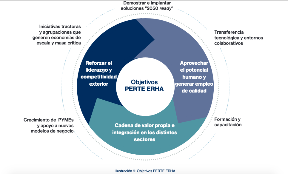El PERTE ERHA es una de las herramientas destacadas del Plan de Recuperación, Transformación y Resiliencia (PRTR) gubernamental, en el cual se establece que casi un 40% de las inversiones contempladas irán a parar a la transición ecológica. ERHA está vinculado a los componentes 7, 8, 9, 10 y 17 del PRTR, dedicados a: las renovables innovadores (7); el almacenamiento, la flexibilidad y los nuevos modelos de gestión inteligente de la energía (8); el hidrógeno renovable (9); la Estrategia de Transición Justa (10); y los planes complementarios de I+D+i (17). Este ámbito troncal incluye 25 medidas transformadoras, con un presupuesto público, aportado por el Miteco, de 3.558 millones. Se calcula que otros 5.390 millones serán aportados por el capital privado.