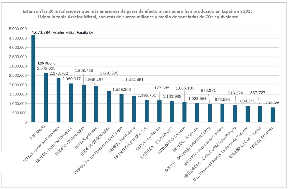 Descarbonización 2026 detalla las "emisiones de gases de efecto invernadero de los sectores y empresas más contaminantes en España" (medidas en toneladas verificadas de CO2eq; el OS aclara que el informe no aborda otros tipos de contaminación al aire, al agua o al suelo, "tema que será objeto de otros estudios con diferente metodología"). El Observatorio de Sostenibilidad ha analizado las emisiones verificadas de las principales empresas de España en el ultimo año disponible, es decir de 2025.