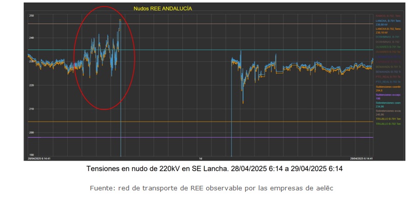 Según aelēc, las tensiones empiezan a oscilar a partir de las 10.00 horas. A las 12.33 el valor de las tensiones se va a cero, al producirse el apagón. Pero poco antes, se registran valores cercanos a 250 kV en una red cuya tensión nominal es 220 kV, valor que sobrepasa los límites considerados admisibles y que provocaron la desconexión de las instalaciones conectadas a la red, al activarse las protecciones automáticas que actuaron de acuerdo con la normativa vigente (Procedimientos de Operación).