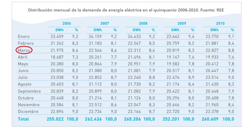 [Junto a estas líneas, a la derecha, tabla que representa la distribución mensual de la demanda de energía eléctrica. Quinquenio 2006-2010. Fuente: Red Eléctrica, REE].