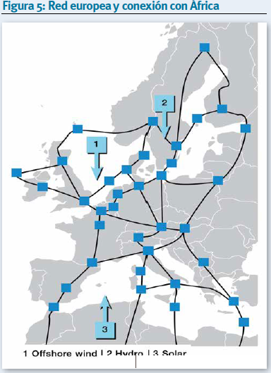 La empresa líder en esta tecnología, ABB, ya presentaba una visión de este tipo en un folleto divulgativo de esta tecnología. Se puede ver en la Fig. 5 como se indica que el sur manda energía solar hacia el norte y desde allí se manda energía eólica e hidráulica hacia el sur. ¿Porque no fantasear pensando que más allá de esto, el Sáhara puede ser el lugar de encuentro y colaboración con el continente africano, como ya anticipó hace tiempo la fundación Desertec?