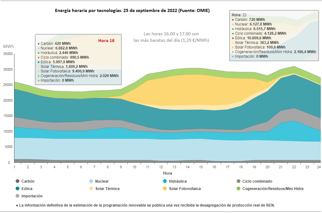 Lo sucedido en el día de hoy presenta matices. Fotovoltaica, termosolar y eólica van a producir muchísima electricidad durante las horas centrales del día y por eso van a abaratar (han abaratado extraordinariamente) el precio de la electricidad en ese lapso. La hidráulica también genera durante el día (2.446 megavatios hora a las cuatro de la tarde, como se aprecia en la imagen), pero deja el grifo relajado esperando a las diez de la noche, cuando el precio del megavatio hora crece hasta los 156,82 euros. En ese momento, a las 22.00 horas, la hidráulica, cuyos costes de generación están en el entorno de los diez euros, si no menos, generará el triple de electricidad: 6.515 megavatios hora, según OMIE.