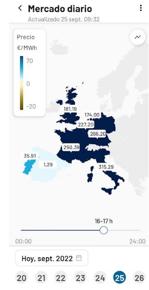 [Bajo estas líneas, a la derecha, precios en los mercados mayoristas europeos. Fuente: Red Eléctrica de España]