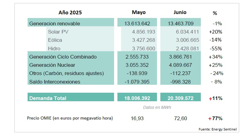 Energy Sentinel -explican desde Greening- utiliza "datos propios y oficiales" para ofrecer "una visión técnica y accesible del sector". El documento tiene como destinatarios a profesionales, medios y actores implicados en la transición energética. Según la compañía, el objetivo del boletín es "contribuir a la comprensión del contexto energético y facilitar el análisis de sus implicaciones". En ese marco, Energy Sentinel quiere constituirse en "una herramienta de información y apoyo a la toma de decisiones en el ámbito energético y también [pretende] aportar datos estadísticos de forma periódica a los profesionales vinculados al sector energético". El primer boletín Energy Sentinel repasa el precio de la electricidad en el mercado mayorista (OMIE) en junio, que alcanzó los 72,60 euros el megavatio hora (€/MWh), un aumento del 77% respecto al mes de mayo. Los autores del informe consideran que el incremento "se explica por una demanda eléctrica un 11% mayor, impulsada por altas temperaturas, y por el mayor peso de la generación de ciclo combinado, que creció un 34%".