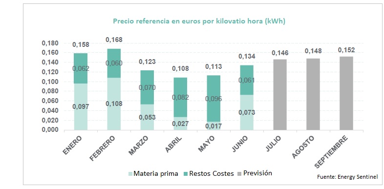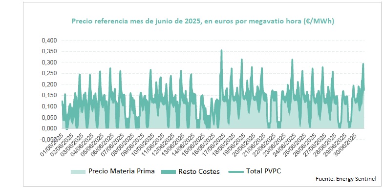 El gráfico que aparece a la derecha, bajo estas líneas, extraído también de esta primera entrega del Energy Sentinel de Greening, refleja la evolución horaria del precio de referencia en el mercado eléctrico español durante el mes de junio. El gráfico desglosa el coste de la materia prima (precio spot) y el resto de componentes de la factura: cargos del sistema, peajes e impuestos. Para contextualizar estos datos, Energy Sentinel ha tomado como base "un cliente residencial tipo, ubicado en su primera vivienda y con un consumo mensual representativo según el perfil medio publicado por Red Eléctrica (REE)".