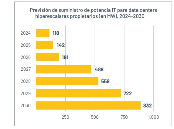 «La trayectoria del crecimiento de la potencia IT de los centros de datos hiperescalares en España tiene una tendencia al alza bastante pronunciada, con una tasa de crecimiento anual compuesto del 38 % entre 2024 y 2030. Este crecimiento se debe tanto al anuncio de nuevos proyectos como a un replanteamiento de los tiempos de entrega. Sin embargo, la energización real sigue dependiendo en gran medida de los planes de refuerzo de la red eléctrica y de los avances normativos» Informe Anual SpainDC 2025, página 60