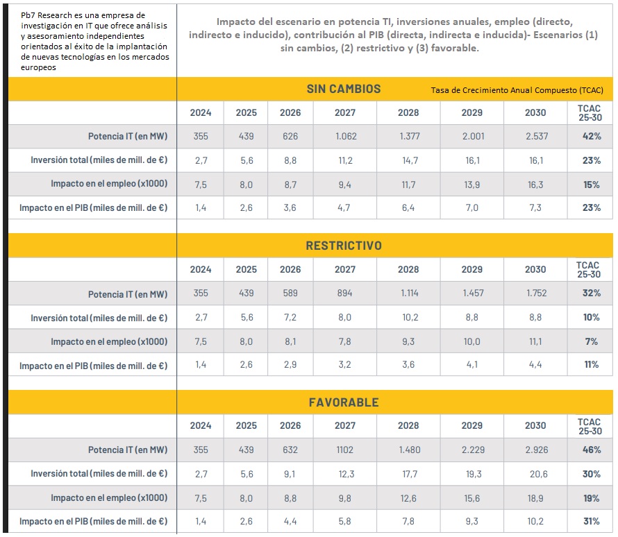 "El crecimiento ya es visible: a cierre de 2025, la potencia TI instalada en centros de datos comerciales (colocation* e hyperescale**) se situó en 439 MW, frente a los 355 MW de 2024, lo que representa un incremento del 24%". Es uno de los datos clave recogidos en el Informe anual 2025 del sector de Centros de Datos en España, que además aventura en sus "Perspectivas para 2030" que, "de mantenerse la tendencia actual, la capacidad podría alcanzar los 2.537 MW en 2030, multiplicando por seis la escala actual del mercado". Spain DC y Pb7 Research estiman que, "si el mercado mantiene su evolución actual, el sector podría captar 66.900 millones de euros de inversión directa e indirecta hasta 2030 (...), el impacto anual en el PIB podría alcanzar los 7.300 millones de euros al final de la década, y el empleo total asociado al sector, podría superar los 16.000 puestos de trabajo".