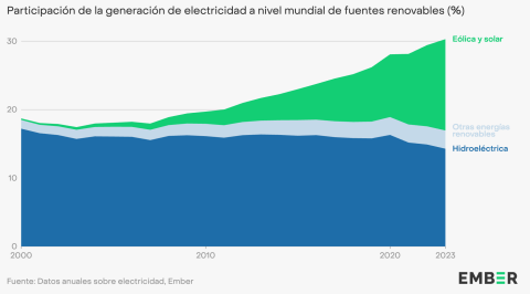 La participación de las energías renovables en el mix eléctrico mundial se situó por encima del 30 % en 2023, y la generación renovable llegó casi al 40 %. Es el titular principal que destaca la quinta edición del Global Electricity Review de Ember, que brinda el primer resumen completo de los cambios en la generación de electricidad a nivel mundial durante el pasado año. Gracias a la energía eólica y fotovoltaica, 102 países tuvieron una participación de las renovables del 30 % o superior (+98 % respecto a 2022); mientras que en otros 69 países esta participación superó el 50 % (por ejemplo, en España).