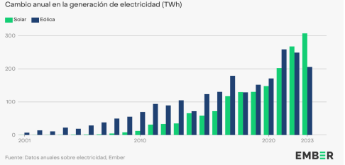 Según el informe, y con estos últimos datos, las cuatro principales economías con crecimiento en electricidad fotovoltaica (China, la UE, Estasdos Unidos y Brasil) representaron el 81 % del crecimiento en 2023. La fotovoltaica añadió más del doble de electricidad nueva, tanto como el carbón en 2023, y fue la fuente de generación de electricidad de más rápido crecimiento por decimonoveno año consecutivo. Además, y por segunda vez, el crecimiento en la generación de electricidad solar a nivel mundial (+307 TWh, +23 %) dejó rezagada a la electricidad eólica (+206 TWh, +9,8 %).