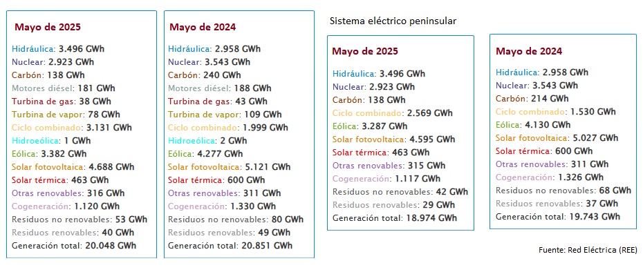 Todas las tablas son de Red Eléctrica, que es el operador del sistema eléctrico nacional. Datos a 01 de junio de 2025.