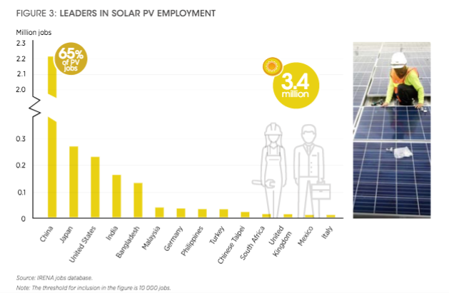 La solar fotovoltaica es la que suma más puestos de trabajo: en este sector, el empleo creció un 8,7% para llegar a 3,4 millones de puestos de trabajo en todo el mundo en 2017, hecho ligado al récord de los 94 GW instalados en fotovoltaica el año pasado (73 GW en 2016). China, India, Estados Unidos y Japón son los mercados más importantes, seguidos por Turquía, Alemania, Australia y Corea del Sur.