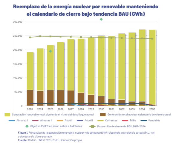 Aunque el aumento de la demanda amplía el margen para instalar renovables, el informe concluye que mantener el calendario de cierre nuclear permite siempre un mayor despliegue limpio que prolongar los reactores.