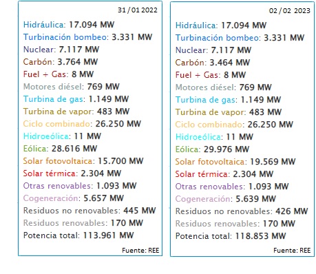 Según Red Eléctrica de España, ahora mismo hay en el país 19.569 megavatios de potencia solar fotovoltaica (FV) vertiendo a red. A ellos habría que sumar los aproximadamente 5.250 megas de autoconsumos (dato UNEF). A 31 de enero del año pasado, o sea, hace un año y dos días, REE computaba en su red 15.700 megavatios, por lo que en doce meses el sector habría conectado (el dato aún es provisional, y será consolidado en unos meses, como de costumbre) 3.869 megavatios de potencia FV. A ellos habría que añadir los autoconsumos que la Unión Española Fotovoltaica estima se han puesto en marcha en 2022: 2.507. Así, el sector habría añadido en 2022 al parque fotovoltaico nacional 6.376 megavatios de nueva potencia. Nunca antes España instaló en un año tanta potencia solar fotovoltaica como lo ha hecho en los doce meses de 2022. Ahora mismo, tal y como se detalla en la tabla aledaña, la potencia acumulada del parque nacional de generación de electricidad supera los 118.000 megavatios.