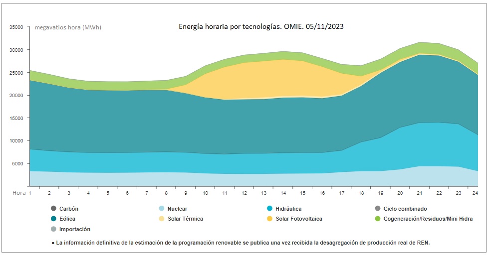 Las centrales nucleares producían 2.956 megavatios hora a las cinco de la madrugada (precio cero) y 4.378 a las 21.00 horas (las horas más caras de ese día fueron las nueve, las diez, las once y las doce de la noche).