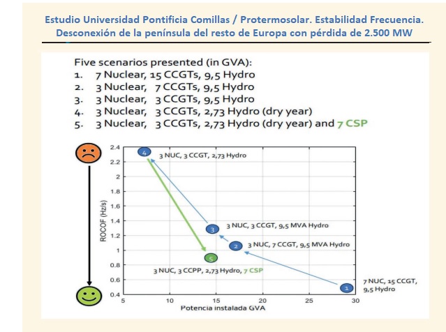 El estudio plantea cinco escenarios a 2030 en los que España está desconectada del sistema eléctrico europeo y, además, a los que aplica una caída de 2.500 megavatios, lo que vendrían a ser dos centrales nucleares y media (véase la tabla de la página anterior). El óptimo para superar esa situación quedaría así: 3.000 megavatios de nuclear, 3.000 de ciclos combinados (gas natural) y 7.000 de termosolar (+2.300 de hidráulica, año seco). Esa es la mejor solución para recuperar la frecuencia en caso de caída de 2.500 megavatios y desconexión con Francia. Nada que ver, pues, con el Plan Nacional Integrado de Energía y Clima, que acaba de ser revisado (se han modificado los objetivos eólico y fotovoltaico al alza), pero que sigue apostando (como el anterior, como el Plan aprobado en 2020) por un parque de ciclos combinados desmesurado (26.000 megavatios).